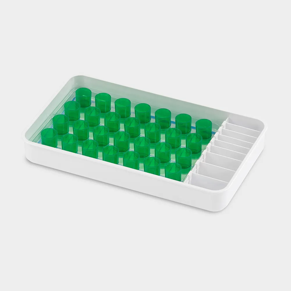 mit Tablett-Einsatz für 28 Becher Tabletten oder Tropfen und Pulver-Tütchen mit Beschriftungsfolie verschiebbarem Teilersystem und Folienstift Maße: L 433 x B 253 x H 55 mm