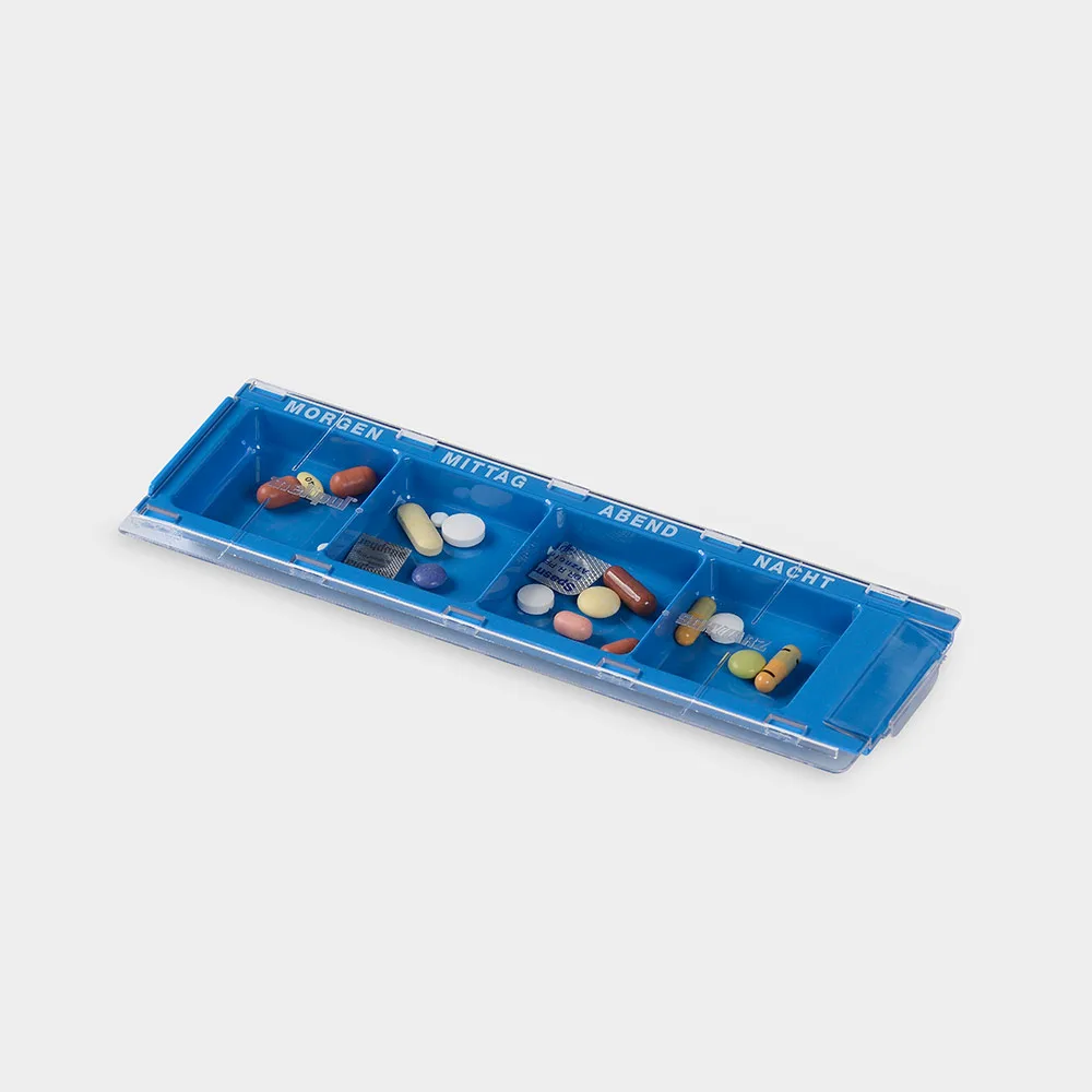 für 1 Tag mit 4 Fächern und Schiebedeckel glasklar große Fächer und große Beschriftung MORGEN MITTAG ABEND NACHT Fachgröße je 50 x 47 x 15 mm hochwertiger Kunststoff spülmaschinengeeignet bis 93 C Deckel glasklar Maße: 225 x 67 x 19 mm