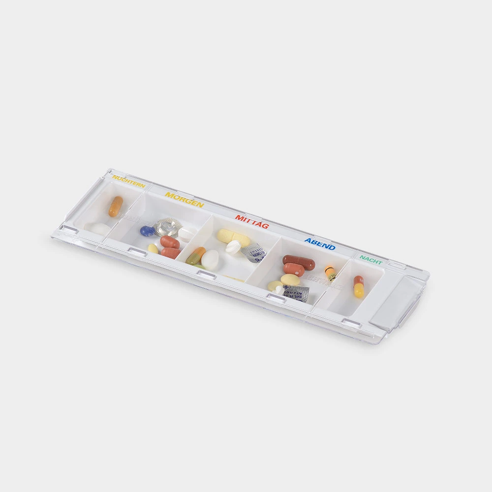 für 1 Tag mit 5 Fächern und Schiebedeckel glasklar große Fächer und große Beschriftung mit Extra-Fach für Nüchternmedikation NÜCHTERN MORGEN MITTAG ABEND NACHT Fachgröße je 50/25 x 47 x 15 mm hochwertiger Kunststoff spülmaschinengeeignet bis 93 C Deckel glasklar Maße: 225 x 67 x 19 mm