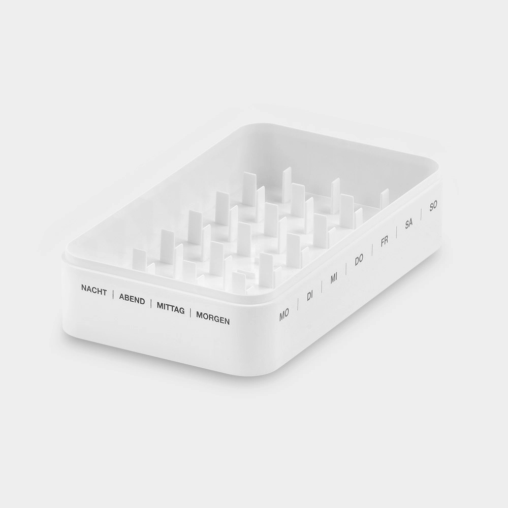 für 7 Tage stapelbar passend für melipul Mehrwerg-Medikamenten-Becher aus hochwertigem Kunststoff hygienegerecht spülmaschinengeeignet bis 93 C Beschriftung der Tageszeiten NACHT ABEND MITTAG MORGEN Aufdruck in anthrazit Abmessungen: L 248 x B 145 x H 52 mm