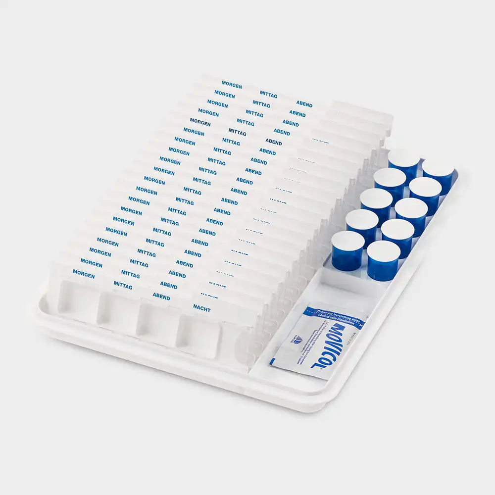 für 20 Tagesdispenser und bis zu 20 Medikamenten-Bechern Farbe: weiß Außenmaße: L 450 x B 340 x H 40 mm
