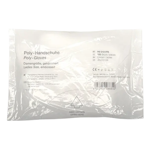 Poly-Handschuhe in Damen- und Herrengröße, gehämmert, unterverpackt zu 100 Stück in der Polytüte und 100 x 100 Stück im Umkarton.